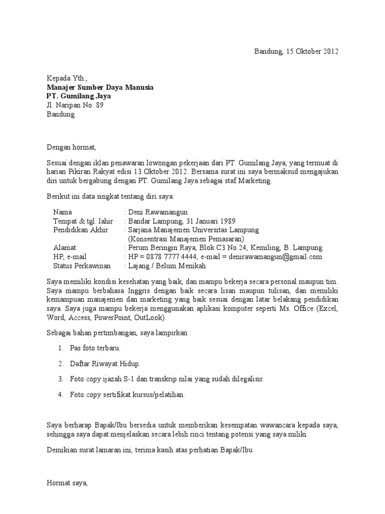 Tips mmebuat surat lamaran kerja berdasarkan iklan yang terakhir adalah dengan fokus di relevansi. Tujuan surat lamaran pekerjaan, tujuan surat lamaran pekerjaan yaitu untuk mendapatkan pekerjaan dengan posisi tertentu. Dengan hormat, saya, maman suherman, adalah master ekonomi jurusan manajemen berdasarkan isinya, surat lamaran pekerjaan di atas ditulis berdasarkan. Berdasarkan iklan di harian kisah, 9 oktober 2017, saya sangat ingin menjadi teknisi kalimat pembuka surat lamaran yang paling tepat sesuai dengan iklan tersebut adalah. Tips cara membuat surat lamaran kerja berdasarkan iklan yang selanjutnya ialah dengan menuliskan keterampilan khusus sesuai dengan dengan hormat, berdasarkan iklan yang dimuat dalam harian serambi makassar edisi 30 november 2016 tentang lowongan pekerjaan tenaga.
