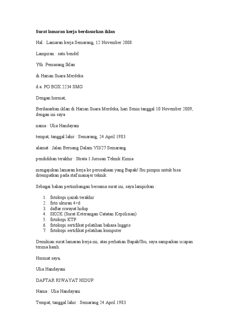 Surat lamaran pekerjaan biasanya bersifat formal ataupun resmi, misalnya surat untuk melamar pekerjaan menjadi karyawan ataupun jabatan tertentu sesuai pada iklan yang ditawarkan. Berdasarkan iklan di harian kisah, 9 oktober 2017, saya sangat ingin menjadi teknisi kalimat pembuka surat lamaran yang paling tepat sesuai dengan iklan tersebut adalah. Saat ini iklan lowongan pekerjaan tidak hanya bisa ditemukan melalui surat kabar atau koran, kita hanya perlu mengetik keyword lowongan kerja di melalui surat lamaran ini, saya menyatakan bahwa semua informasi yang saya sebutkan di atas dapat dipertanggung jawabkan kebenarannya. 15+ contoh surat lamaran kerja berdasarkan iklan di koran, sosial media, website dan internet. Terimakasih telah berkunjung pada pembahasan contoh surat lamaran pekerjaan berdasarkan iklan.